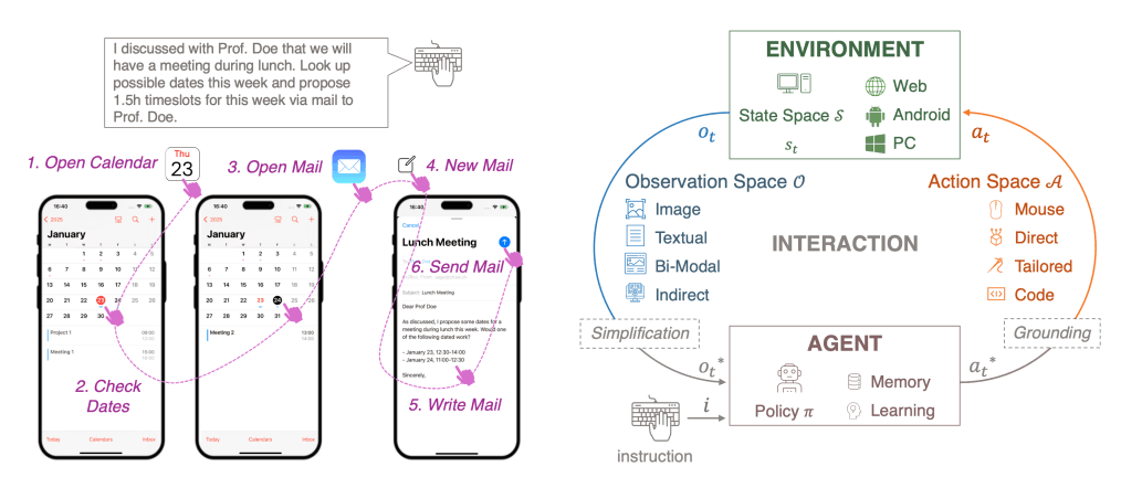 Perspectiva da Interação: Define como os agentes percebem e interagem com o ambiente. Isso envolve a forma como as informações são coletadas (por meio de screenshots, HTML ou logs do sistema) e os tipos de ações disponíveis (como comandos de teclado, mouse ou geração de código executável).