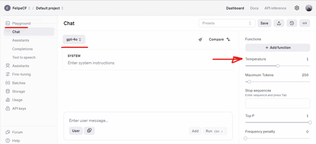 Ajuste de Temperatura em LLM via Playground OpenAI. Fonte: Print do autor em julho 2024.