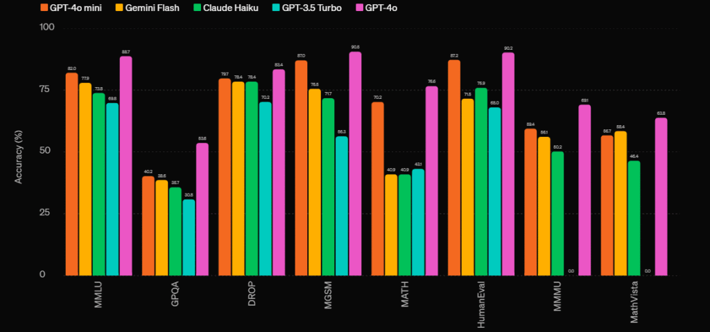 O GPT-4o Mini alcança uma pontuação impressionante de 82% no Massive Multitask Language Understanding (MMLU), uma métrica que avalia a capacidade do modelo de entender e processar uma variedade de tarefas de linguagem natural.