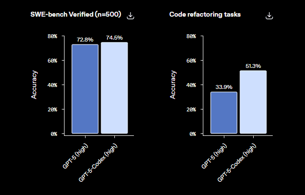 O gráfico abaixo (documentação oficial) oferece uma visão clara da sua capacidade, comparando a acurácia do GPT-5 (base) com a do GPT-5-Codex (otimizado) em duas tarefas críticas: a resolução de problemas no SWE-bench (Software Engineering Benchmark) e a refatoração de código.