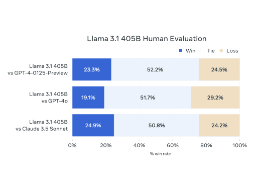 Comparado com o Claude 3.5 Sonnet, o LLaMA 3.1 mostra uma taxa de “vitória” de 24,9%, empatando em 50,8% das vezes e perdendo em 24,2% dos casos da amostragem de utilização.