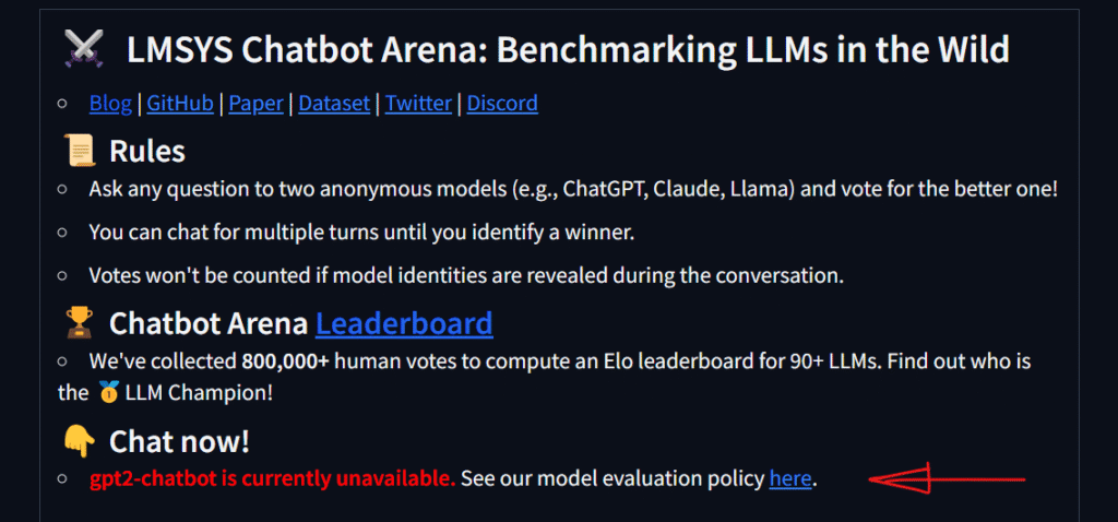 Até a data de 01 de maio de 2024, o modelo permanece desativado, após a viralização de diversos vídeos na internet sobre este misterioso “gpt2-chatbot”.