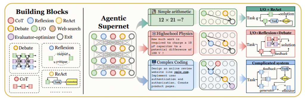 Para resolver isso, o MaAS propõe algo diferente: em vez de buscar UMA arquitetura perfeita, ele otimiza o que os cientistas chamaram de “super-rede agêntica” (Agentic Supernet).